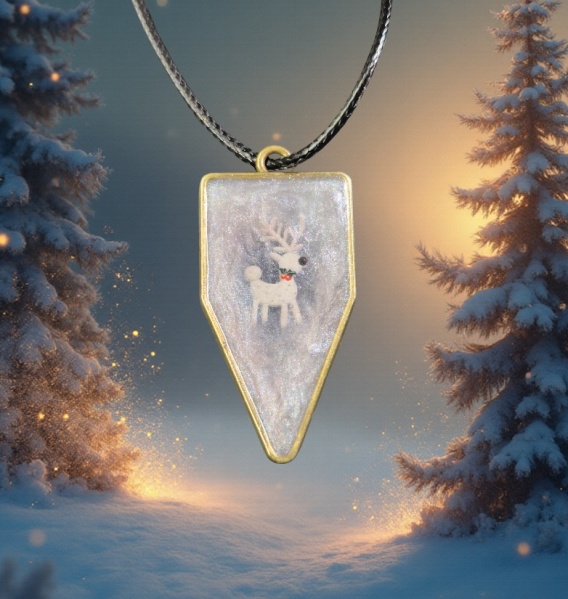 Dwustronny medalion z kolekcji Zwierzęta z motywem białego renifera. 🦌 Subtelna, jasna kompozycja z delikatnym połyskiem tworzy spokojny, zimowy klimat. ✨ Zawieszony na rzemyku z czarnej eko skóry – wygodny i lekki w noszeniu. 🖤 Unikatowa biżuteria tworzona ręcznie. 🌙
