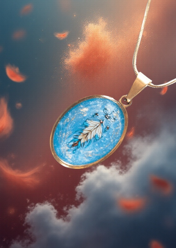 Owalny medalion utrzymany jest w perłowo-niebieskiej kolorystyce, która przywodzi na myśl niebo, wodę i wewnętrzny spokój 💙. Centralnym motywem jest białe pióro, delikatnie zakończone niebieskimi fragmentami, nadającymi kompozycji lekkości i ruchu.