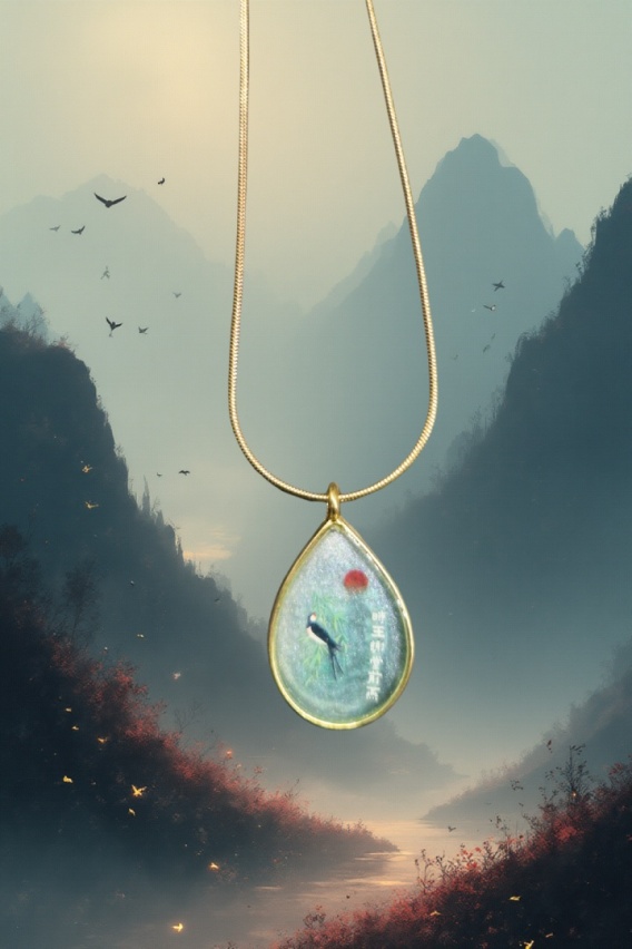 Naszyjnik „Fuji Morning” to ręcznie wykonany wisiorek w kształcie delikatnej kropli/łezki 💧, w której zamknięto morskie odcienie zieleni i błękitu, białe japońskie znaki oraz czerwony księżyc 🌕, tworząc kompozycję pełną harmonii, natury i japońskiej estetyki. W centrum motywu znajduje się siedzący ptak 🕊️, symbol spokoju, czujności i dobrych znaków na przyszłość. W tle można dostrzec subtelnie zarysowaną formę przypominającą Górę Fuji 🗻 – delikatną, mglistą, jak o świcie.