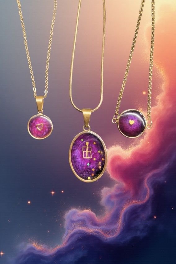 💗 Duży naszyjnik z owalnym wisiorem – intensywny róż z czarnymi krawędziami, mieniąca się żywica UV i złote detale tworzą efekt „magicznej przestrzeni”. Łańcuszek typu snake 45 cm + 5 cm regulacji. 💗 Bransoletka z okrągłym medalionem – delikatny różowy środek i złote serce subtelnie przyciągają wzrok. 💗 Naszyjnik z małym wisiorkiem (60 cm) – niezwykle lekki, minimalistyczny i finezyjny. Idealny do codziennych stylizacji każdej kobiety.