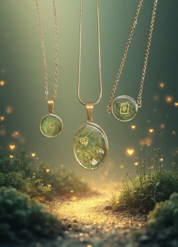 Komplet „Złote Serce Natury” ✨ – komplet trzech ręcznie tworzonych elementów: duży owalny naszyjnik, delikatny naszyjnik 60 cm oraz bransoletka z motywem serca 💚. Zielona żywica UV, złote akcenty i pozłacana stal tworzą biżuterię pełną blasku, elegancji i naturalnego uroku.