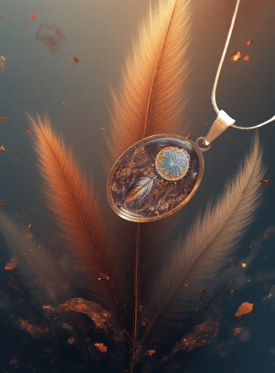 Owalny medalion utrzymany jest w chłodnym, perłowo-brązowym odcieniu, który tworzy eleganckie i spokojne tło dla centralnego motywu. W centrum znajduje się pomarańczowy okrąg, przypominający słońce lub rytualny amulet, z delikatnym, jasnoniebieskim kwiatem w środku 🌸. Z dolnej części kompozycji zwisa pióro 🪶 – symbol ochrony, wolności i połączenia ze światem duchowym.