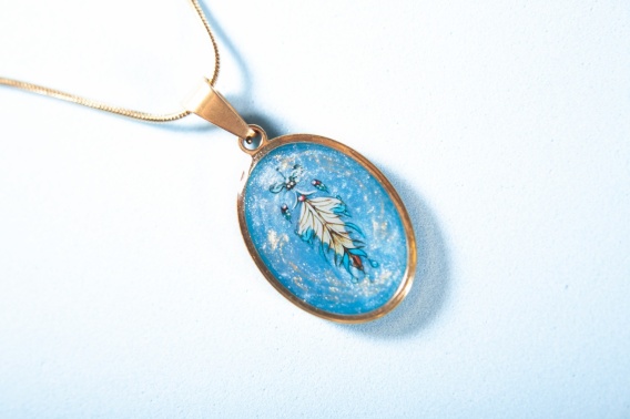 Owalny medalion utrzymany jest w perłowo-niebieskiej kolorystyce, która przywodzi na myśl niebo, wodę i wewnętrzny spokój 💙. Centralnym motywem jest białe pióro, delikatnie zakończone niebieskimi fragmentami, nadającymi kompozycji lekkości i ruchu.