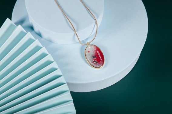 Zawieszony na pozłacanym łańcuszku stalowym o grubości 1,2 mm 🔗, długość 45 cm + 5 cm przedłużki, wygodny do noszenia codziennie. Wykonany ręcznie z żywicy, motyw jednostronny — każdy egzemplarz niepowtarzalny 🌿.