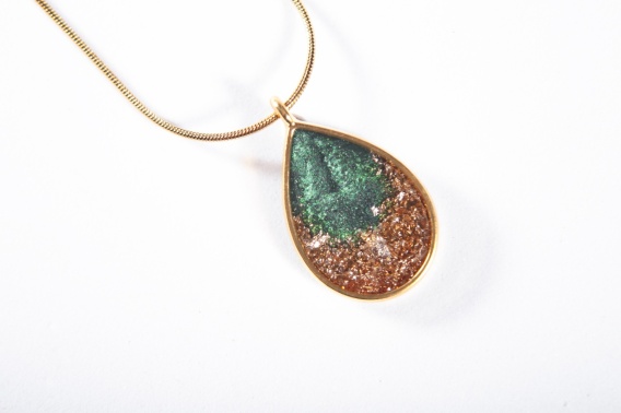 Medalion w kształcie łezki wypełniony jest perłową miką w odcieniach zieleni – od jaśniejszej po głębszą, ciemniejszą. Zielone wypełnienie samo w sobie tworzy kształt łezki, nadając kompozycji harmonii i miękkości formy.