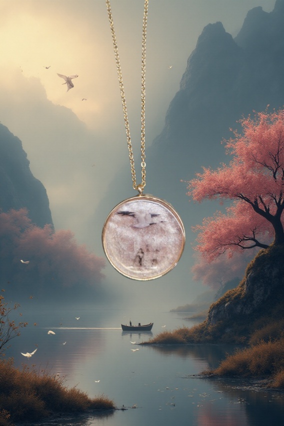 Perłowo-różowy naszyjnik z ptakiem w locie i japońskimi górami 🕊️⛰️