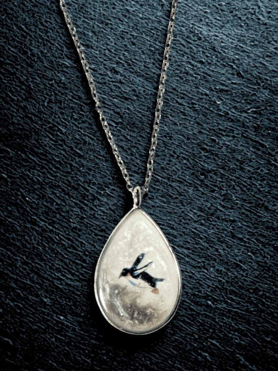 Medalion ma kształt łezki, który naturalnie kojarzy się z wodą i ruchem. Subtelny połysk powierzchni sprawia, że naszyjnik pięknie reaguje na światło, pozostając jednocześnie bardzo lekki w odbiorze.