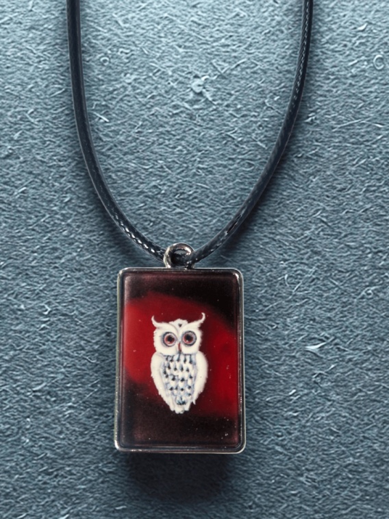 Artystyczny naszyjnik z białą sową na intensywnym, czerwono-czarnym tle 🦉🌑 Prostokątny wisior na czarnym rzemyku – symbol czujności, ochrony i nocnej intuicji.