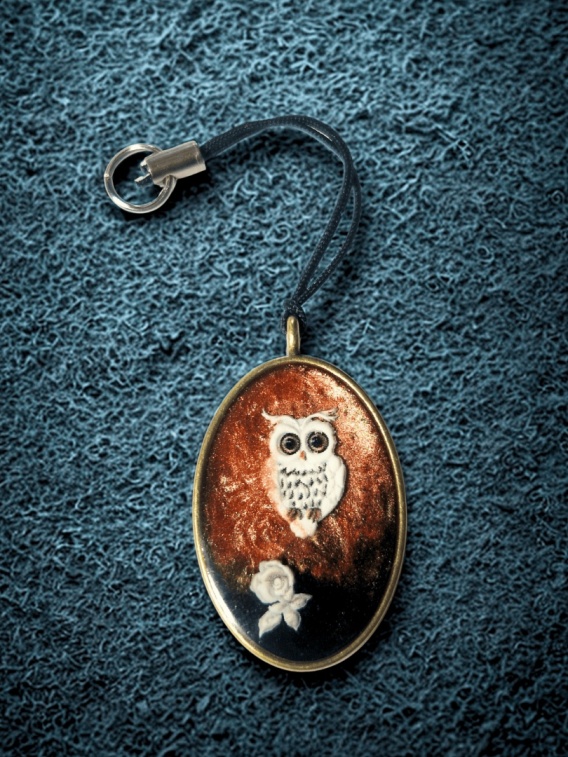 Artystyczna zawieszka z motywem białej sowy na miedziano-czarnym tle 🦉🌙 Symbol intuicji, ochrony i uważności – unikatowy dodatek handmade.