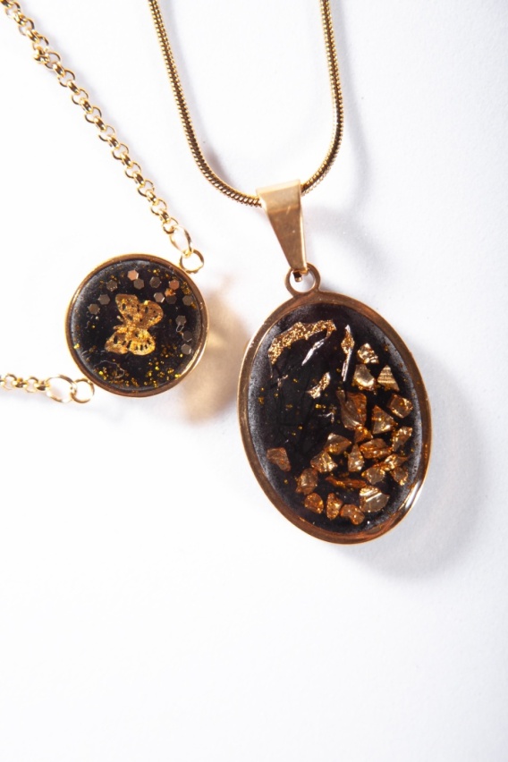 Bransoletka utrzymana jest w tej samej stylistyce, jednak jej medalion ma kształt koła. Na czarnym tle pojawia się złoty motyl – symbol lekkości i siły – uzupełniony złotym brokatem oraz złotą miką, które subtelnie odbijają światło. Bransoletka posiada regulowany łańcuszek, dzięki czemu łatwo dopasowuje się do nadgarstka.