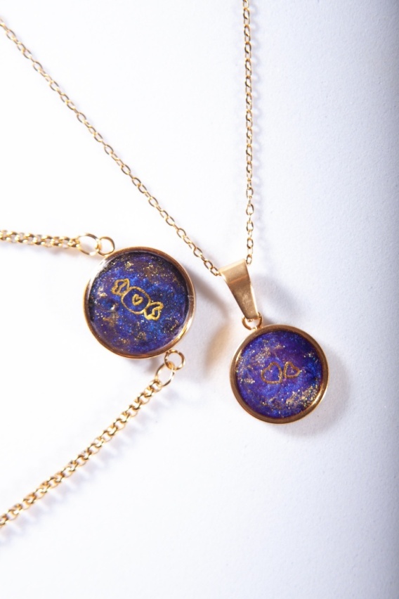 Bransoletka posiada okrągły medalion z ciemnym, granatowo-złoto-czarnym tłem. Centralnym motywem jest złoty cukierek, w którego wnętrzu znajduje się małe serduszko – symbol słodkiego gestu, troski i prezentu od serca. Bransoletka zawieszona jest na klasycznym, regulowanym łańcuszku, który pozwala na wygodne dopasowanie do nadgarstka.