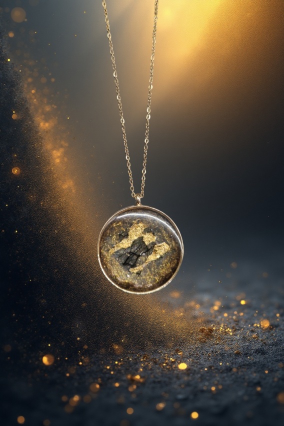 Okrągły medalion posiada transparentne tło, które nadaje kompozycji lekkości i przestrzeni. Wzdłuż krawędzi zatopiona została perłowa, połyskująca mika w odcieniu brązu, tworząca subtelną ramę. Całość uzupełniają drobinki złotej miki, które delikatnie odbijają światło.