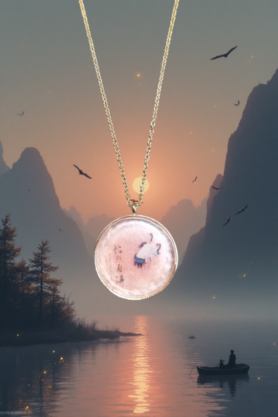 Okrągły medalion posiada perłowo-różowe tło, delikatnie połyskujące na biało, które nadaje całości lekkości i szlachetnego charakteru. Po prawej stronie medalionu znajdują się dwa żurawie w kolorystyce biało-czarnej z charakterystycznymi czerwonymi akcentami na głowach – symbole długowieczności, harmonii i wierności w kulturze Dalekiego Wschodu.